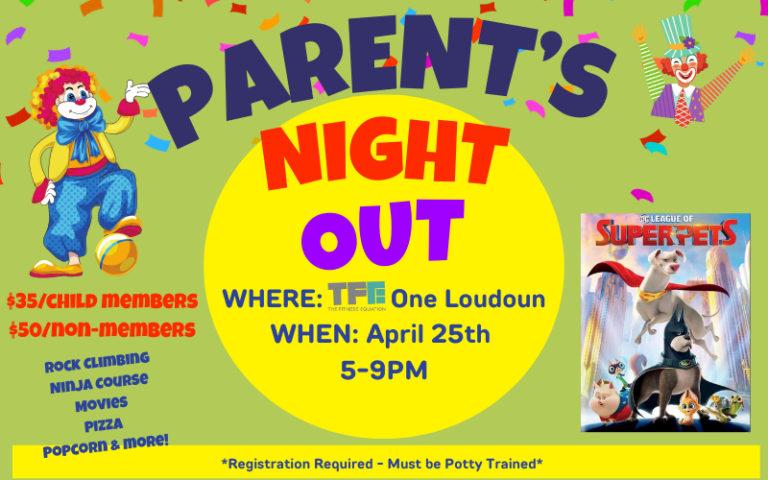 Parents’ Night Out at The Fitness Equation One Loudoun gives parents the opportunity to enjoy a relaxing evening while their kids enjoy a fun, safe,